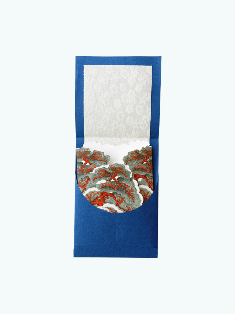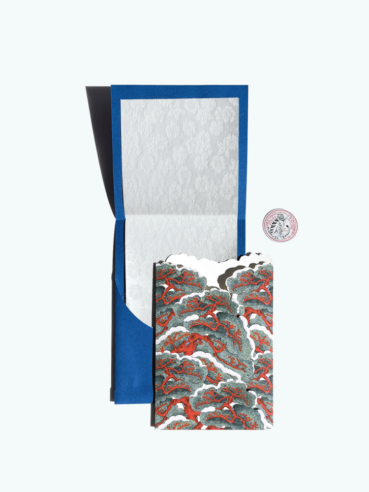 일월오봉도의 소나무를 입체적으로 담은 2단 접이식 카드입니다. 카드 앞면에는 푸른 소나무 숲에 눈이 내린 모습을, 뒷면에는 설원을 뛰어노는 옥토끼의 천진함을 담았습니다.
