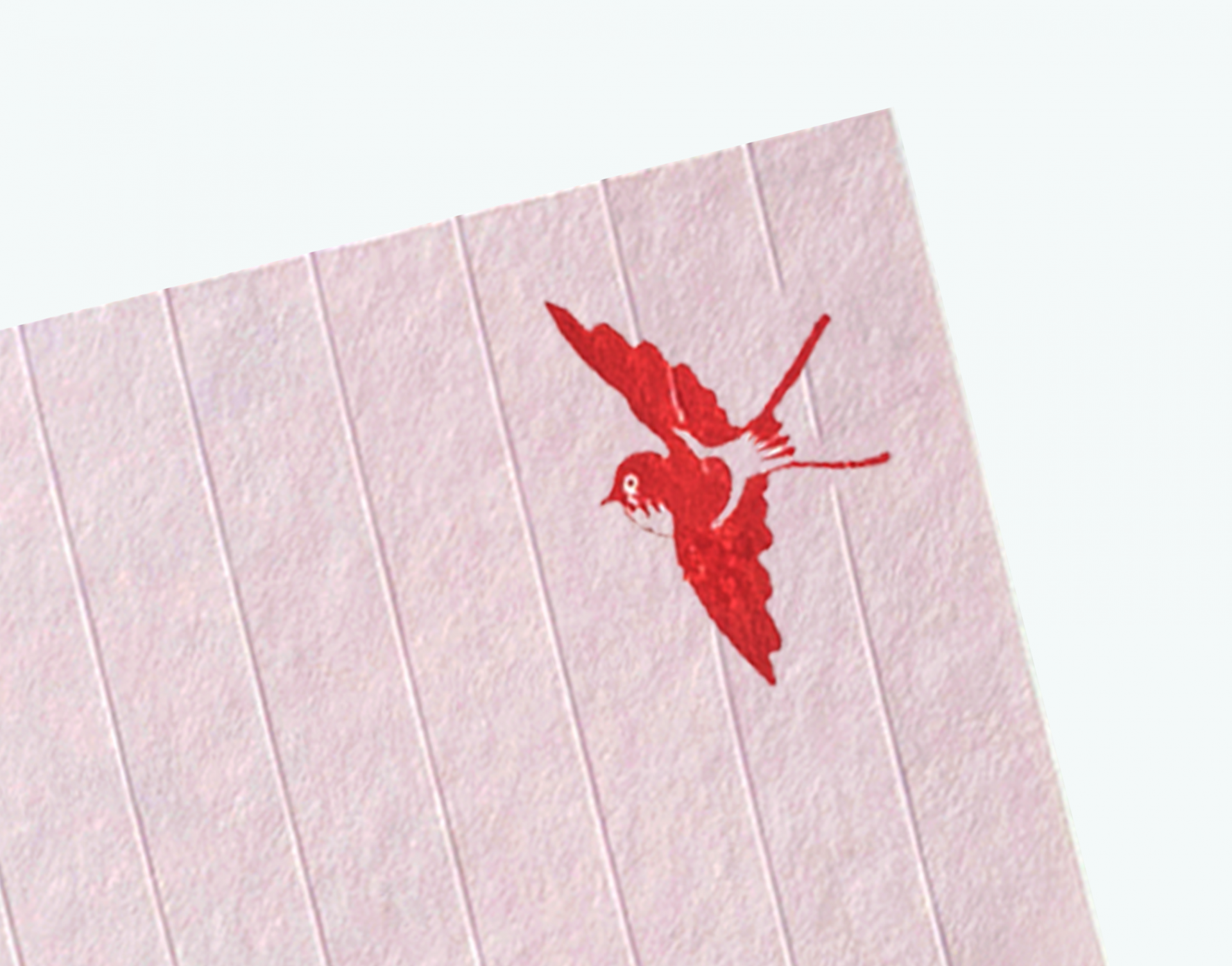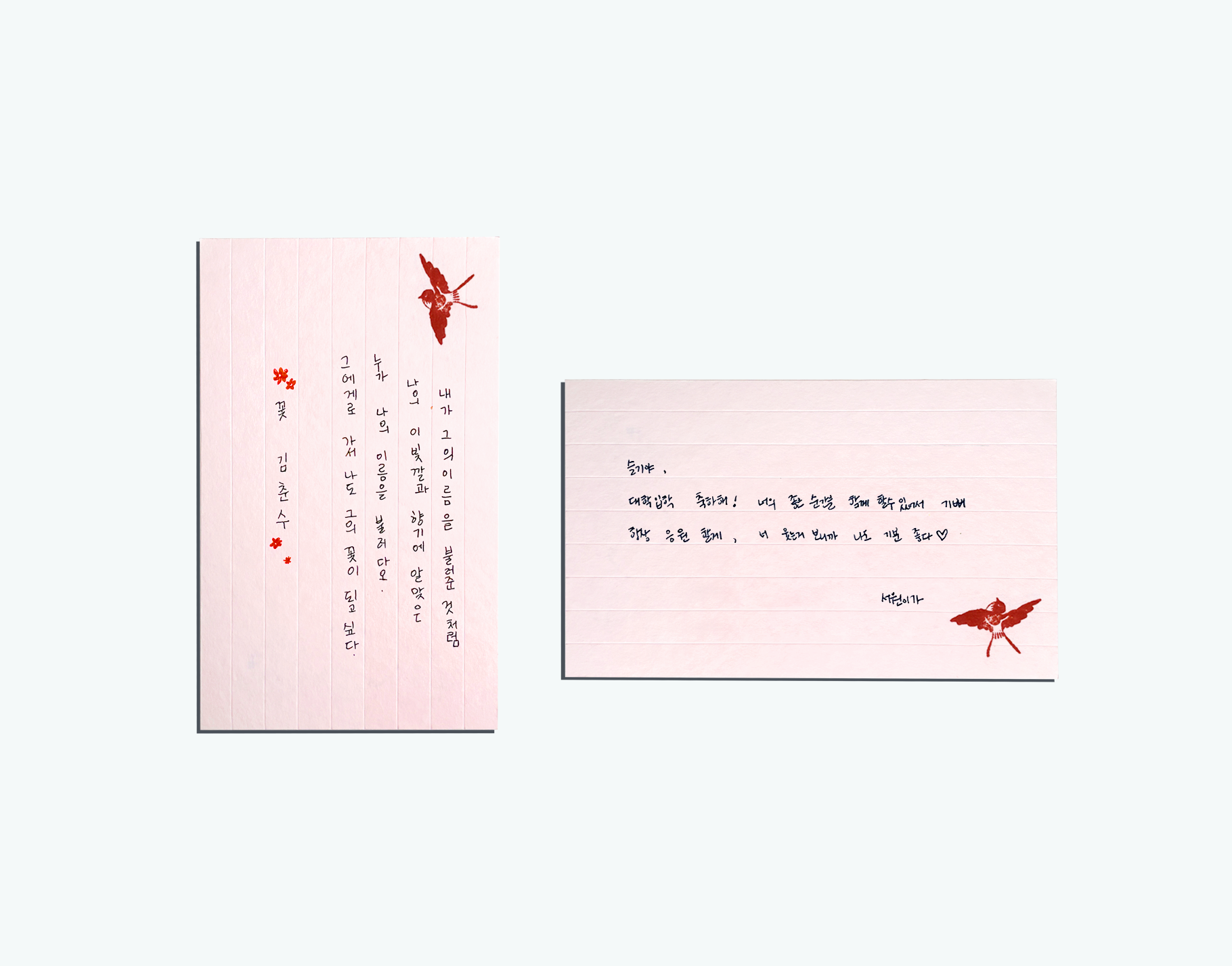 제비와 시전지는 손으로 만지면 느껴지는 탄탄한 한지 질감의 연홍화색 종이에 엠보싱으로 줄선을 나타내어 종이의 질감을 극대화 했습니다. 제비를 도장으로 찍어 종이에 자연스럽게 번지고 덜 찍혀 정형화되지 않은 디테일이 매력적인 시전지입니다.