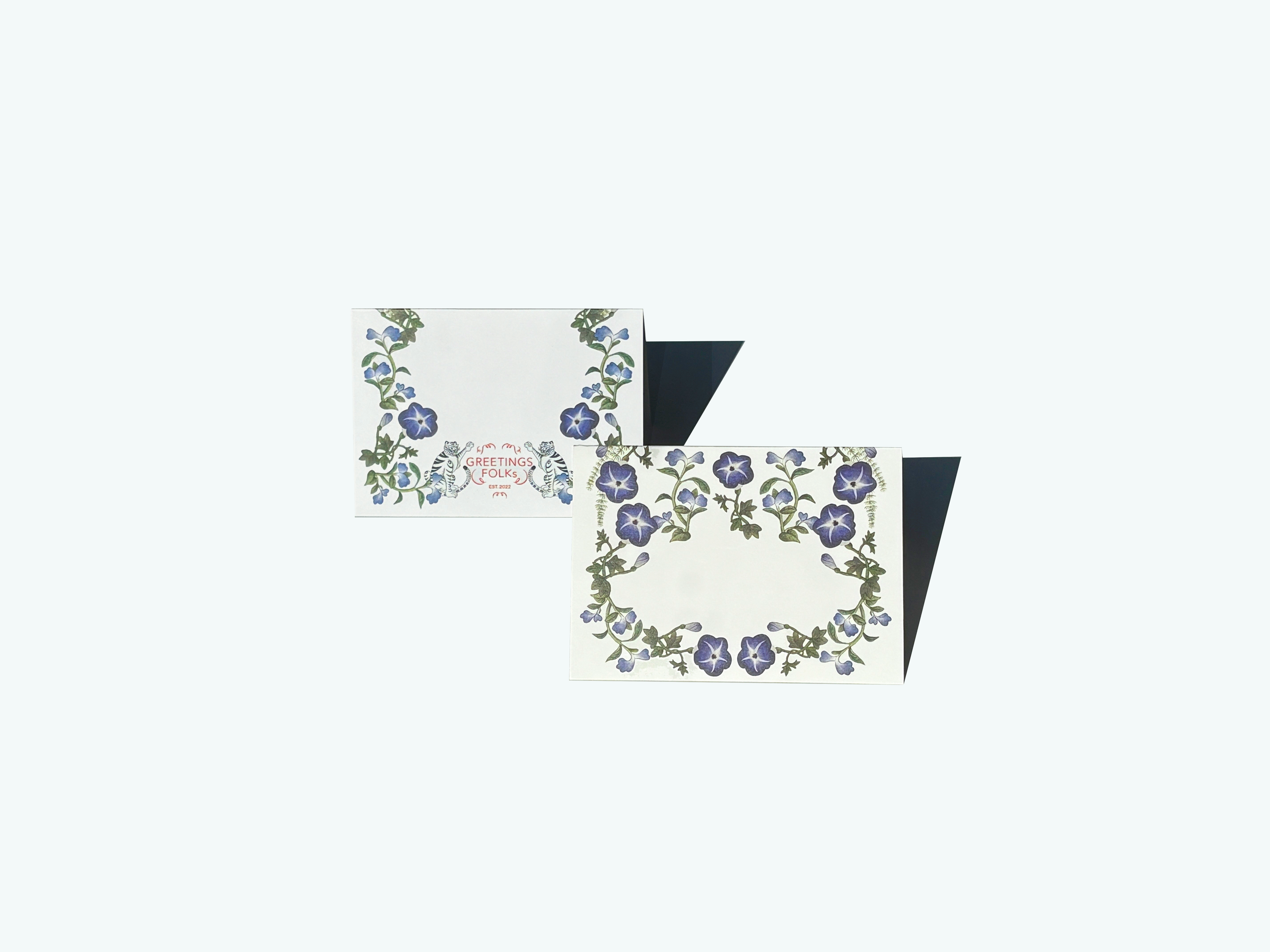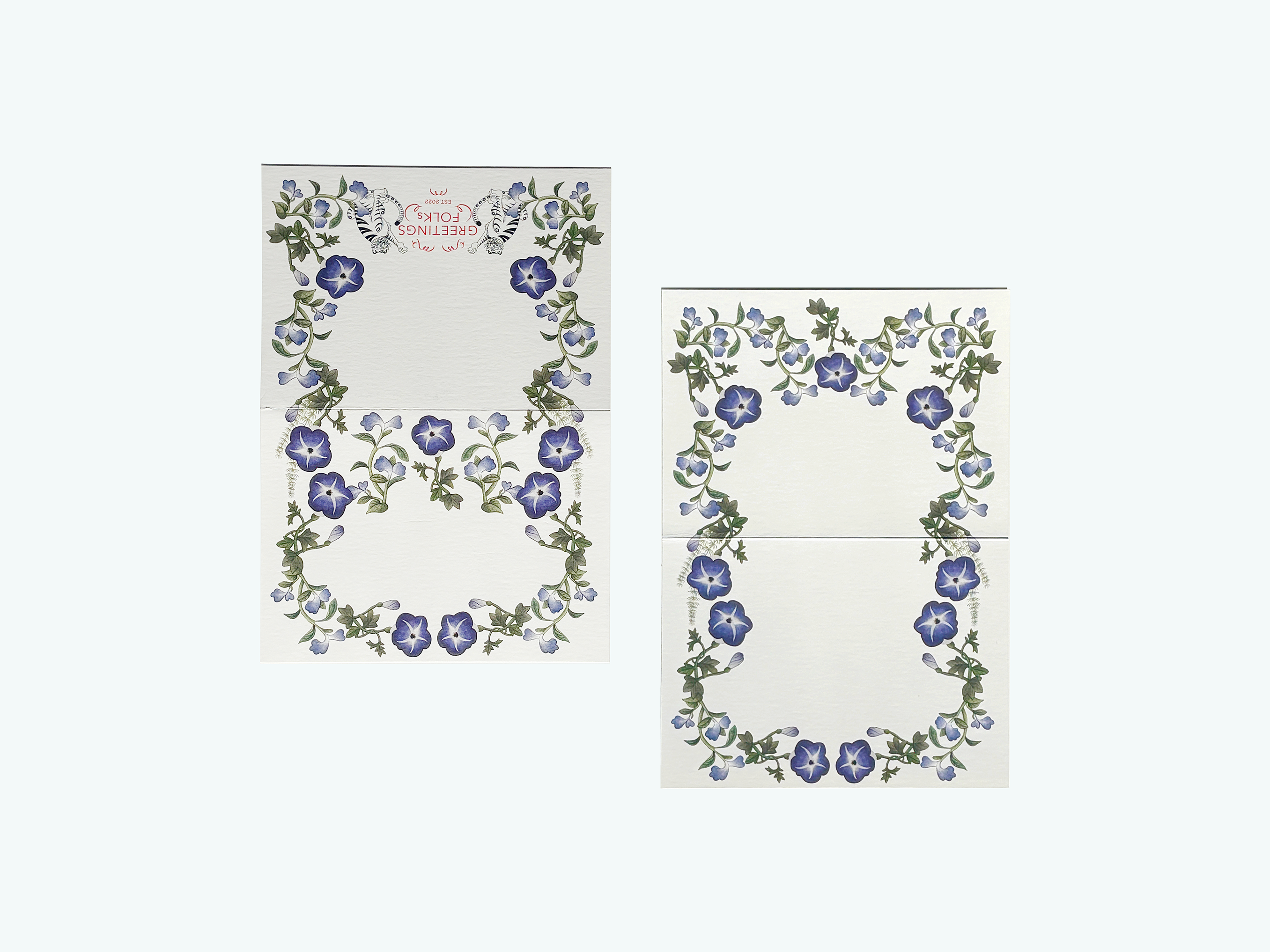 초충도 한켠에 작게 피어나는 메꽃은 사방으로 뻗은 덩굴과 엷은 깔때기 모양의 꽃이 어우러져 6~8월 사이에 피어납니다. 이 카드는 그 메꽃을 민화와 식물화(Botanical Illustration) 기법으로 재해석해 담았습니다. 닭의장풀과 함께 덩굴이 온 카드를 감싸듯 번지는 모습으로 디자인되었으며, 앞면에는 짧은 글귀를, 카드를 펼쳤을 때는 편지 글과 꽃 덩굴이 함께 어우러져 한 폭의 그림처럼 보이도록 구성했습니다.